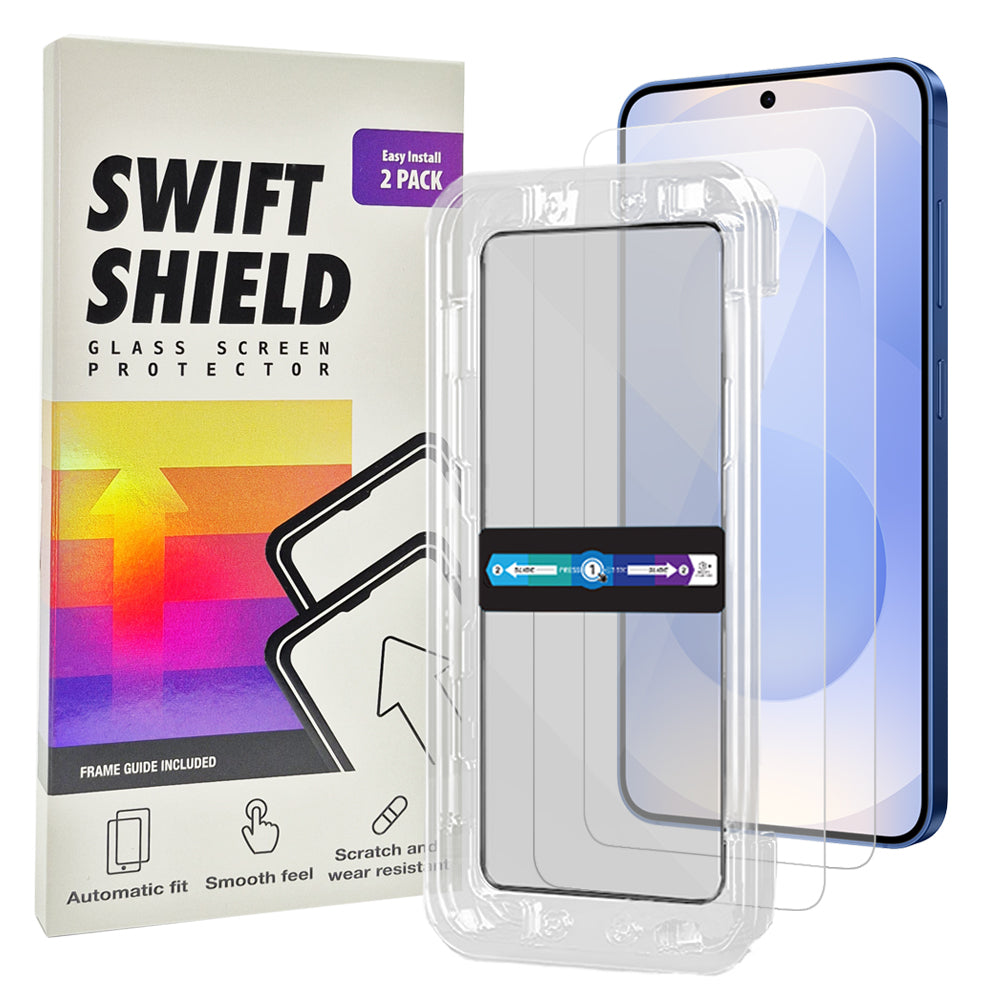 SwiftShield Clear Premium Tempered Glass Screen Protector Alignment Kit for Samsung Galaxy S25 [2-Pack] Protect your precious device with a layer of tempered glass (goodbye to scratches and cracks!). The SwiftShield Clear Premium Tempered Glass Screen Protector Alignment Kit ensures precise installation for your Samsung Galaxy S25, so you can have peace of mind and a crystal-clear view at all times.