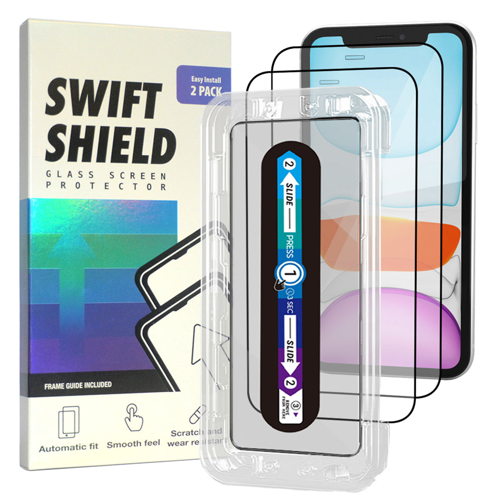 SwiftShield Clear Premium Tempered Glass Screen Protector Alignment Kit for iPhone 11 [2-Pack] Protect your precious device with a layer of tempered glass (goodbye to scratches and cracks!). The SwiftShield Clear Premium Tempered Glass Screen Protector Alignment Kit ensures precise installation for your iPhone 11, so you can have peace of mind and a crystal-clear view at all times.