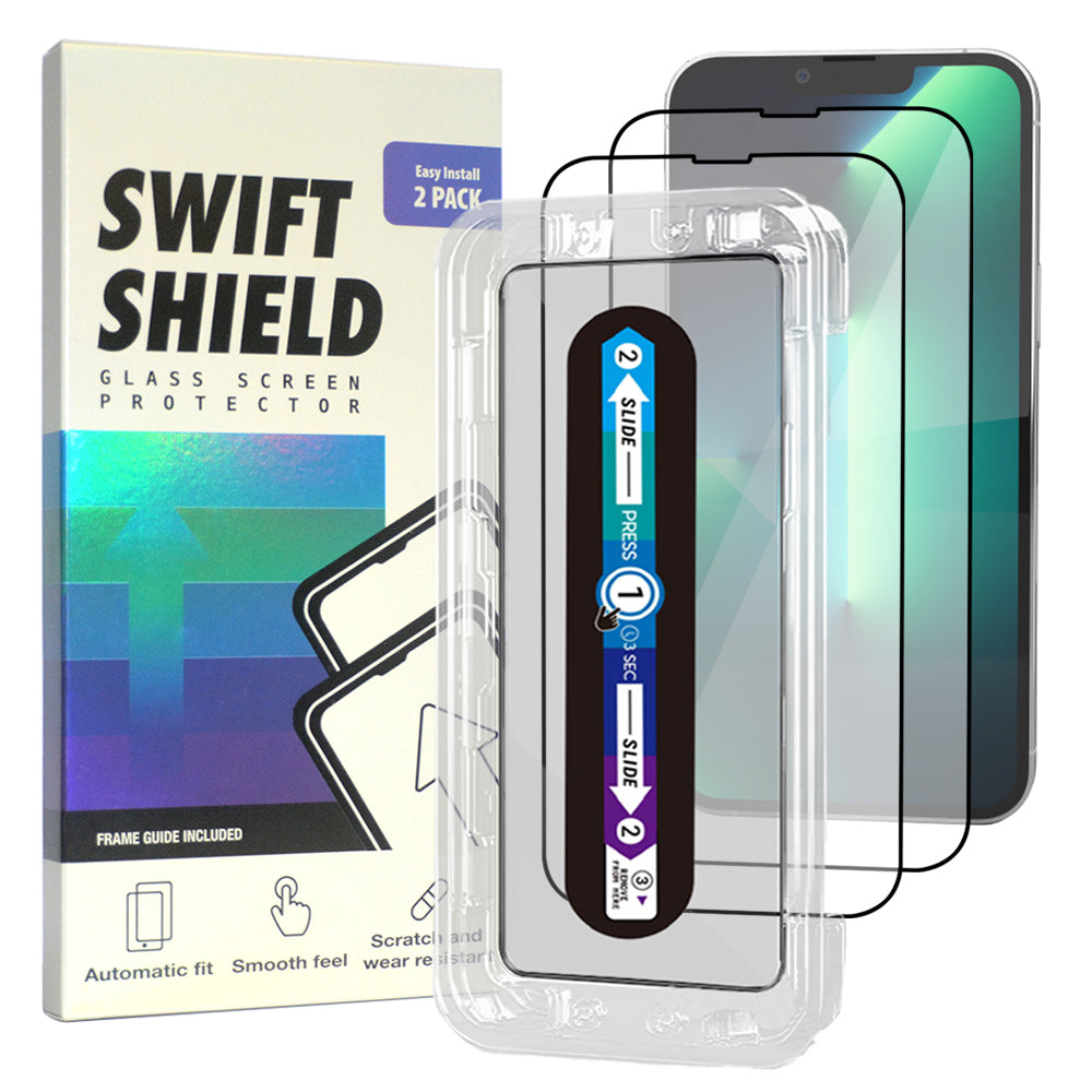 SwiftShield Clear Premium Tempered Glass Screen Protector Alignment Kit for iPhone 13 Pro Max [2-Pack] Protect your precious device with a layer of tempered glass (goodbye to scratches and cracks!). The SwiftShield Clear Premium Tempered Glass Screen Protector Alignment Kit ensures precise installation for your iPhone 13 Pro Max, so you can have peace of mind and a crystal-clear view at all times.