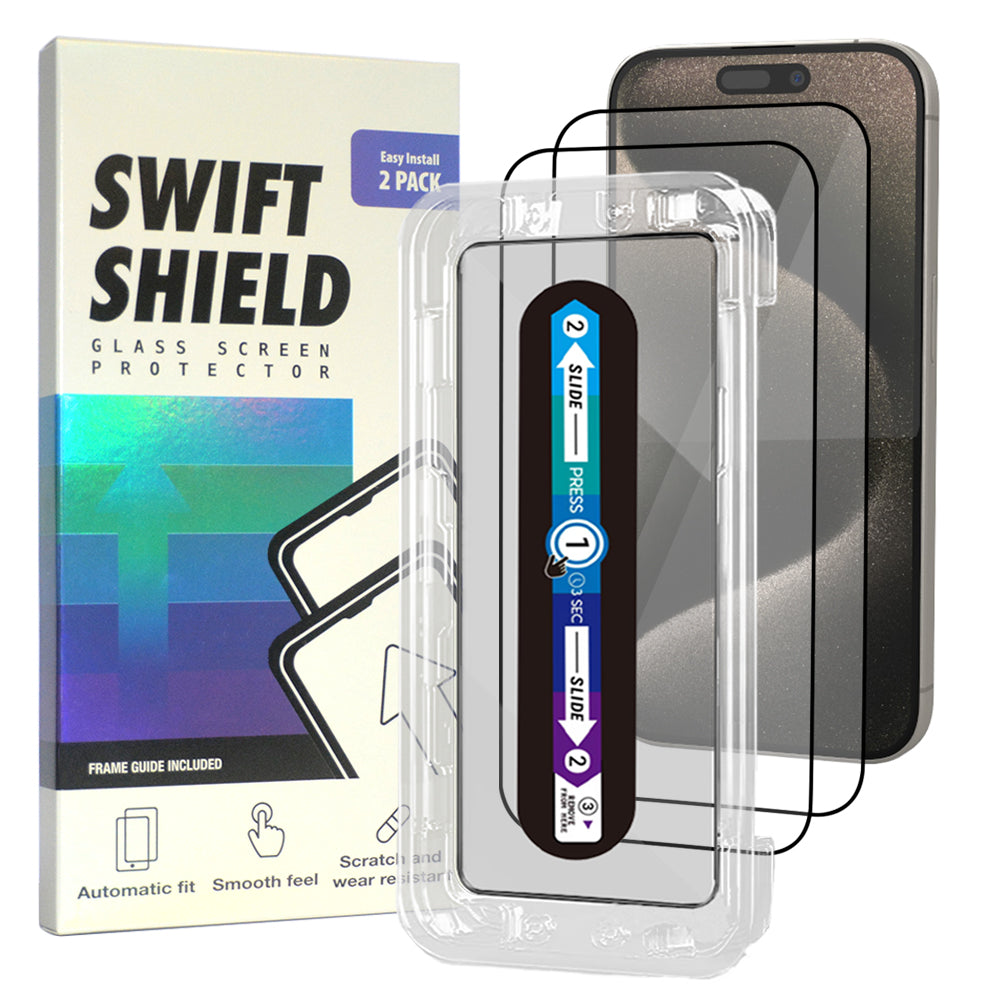 iPhone 15 Pro Max Tempered Glass Screen Protector [2-Pack] with Easy Alignment Frame – Clear, Premium by SwiftShield
