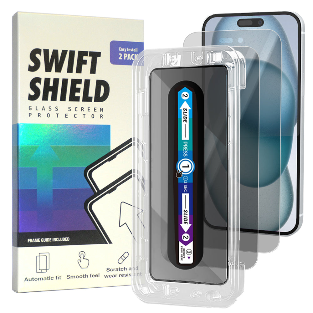 iPhone 15 Tempered Glass Screen Protector [2-Pack] with Easy Alignment Frame – Privacy, Premium by SwiftShield