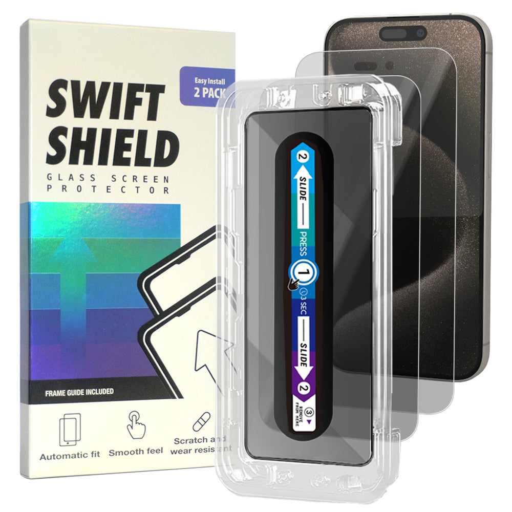 iPhone 15 Pro Max Tempered Glass Screen Protector [2-Pack] with Easy Alignment Frame – Privacy, Premium by SwiftShield